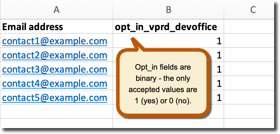 Also, for every email address on your file, there must be a number 1 in the opt_in column (which translates to 'yes') to indicate that the contact should be included in your CSU's contact pool.
