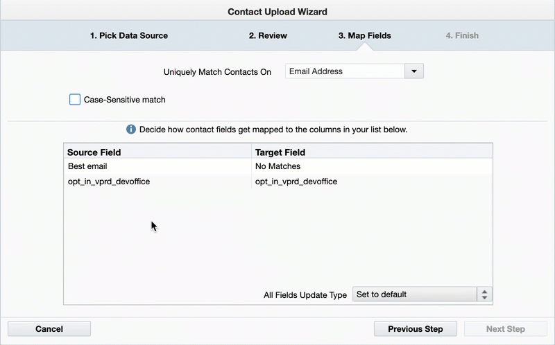 - Source Field is what you've named your column headers on your file. Target Field is where Eloqua will place this data. If you see a row that says 'No Matches', you MUST correct this before proceeding. If Eloqua doesn't recognize your column header as matching one of its field names, it may take a best guess as to where your data belongs. Do not let this happen. To correct a situation in which you have no matches, double-click on the row in question, and find the correct field in the Target Field dropdown menu. There's no need to make a change to the Update Type field. Click anywhere outside the window to close it, review to make sure that your fields are mapped correctly, and click Next Step.