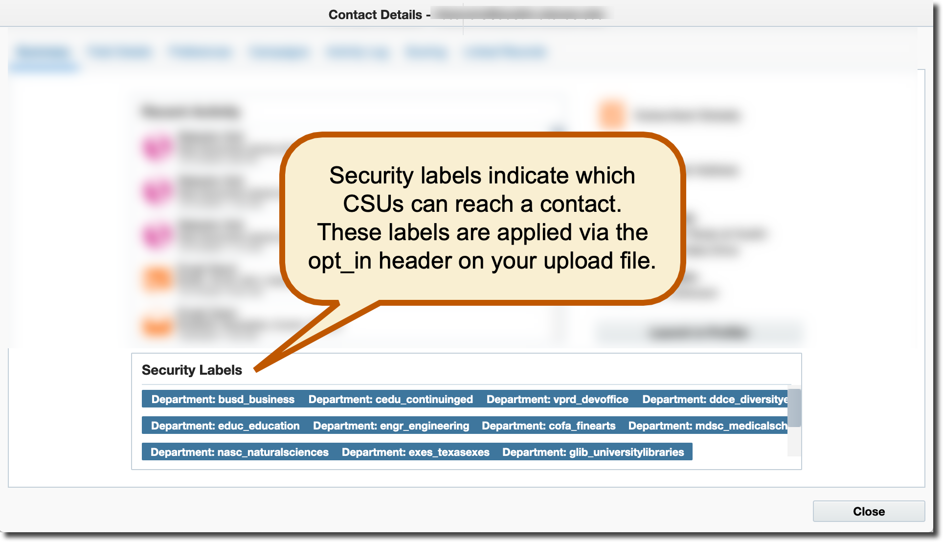 We have a Security Label Program running behind the scenes, which reads these opt_in column headers upon upload, and applies the appropriate security labels to each contact. This program sifts each uploaded contact through a series of steps to determine where each belongs (which can be multiple CSUs).